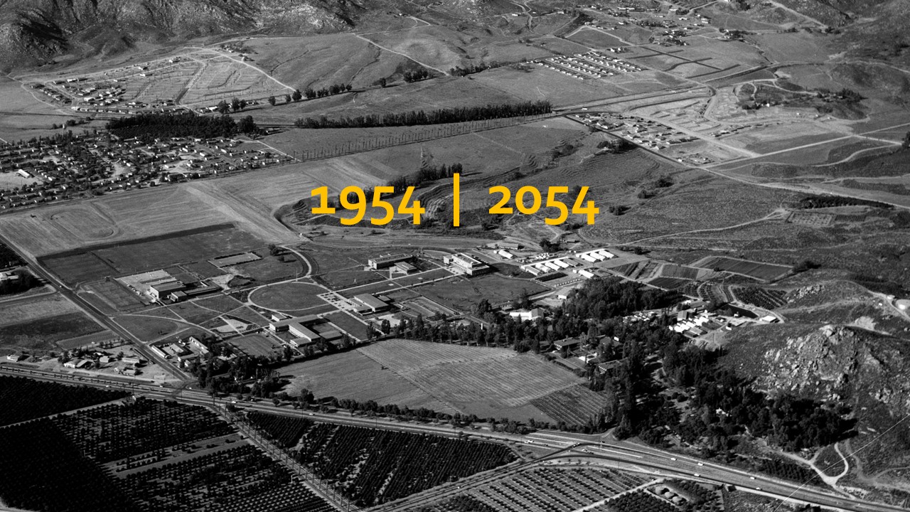 An image of the UCR campus at it's founding in 1954. The numbers "1954 | 2054" are written in gold on the image.